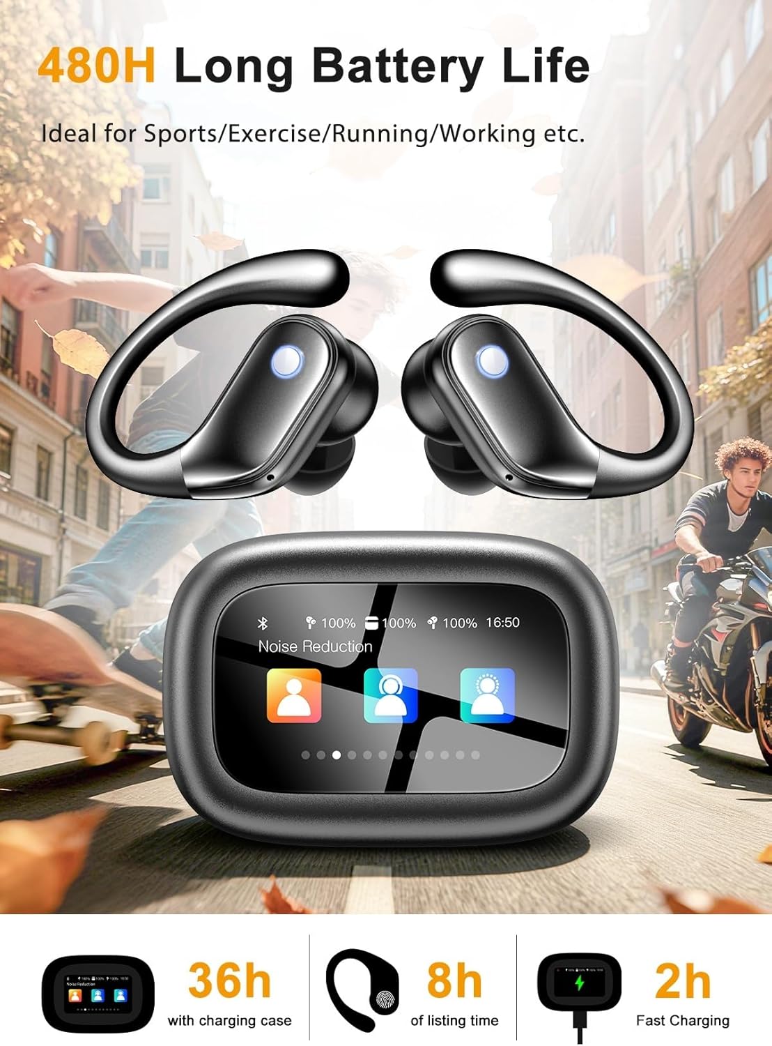 Revolutionary Touchscreen Control Case: Breaking traditional sports earbud design. our Bluetooth earbuds feature not only smart single-tap controls but also an multifunction touchscreen charging case. With fingertip touches. effortlessly switch songs. adjust volume. 5 EQ modes. locate earbuds. or take calls. Whether in work meetings or intense workouts. the Smart Interactive System keeps your music experience effortlessly smooth—delivering true hands-free control