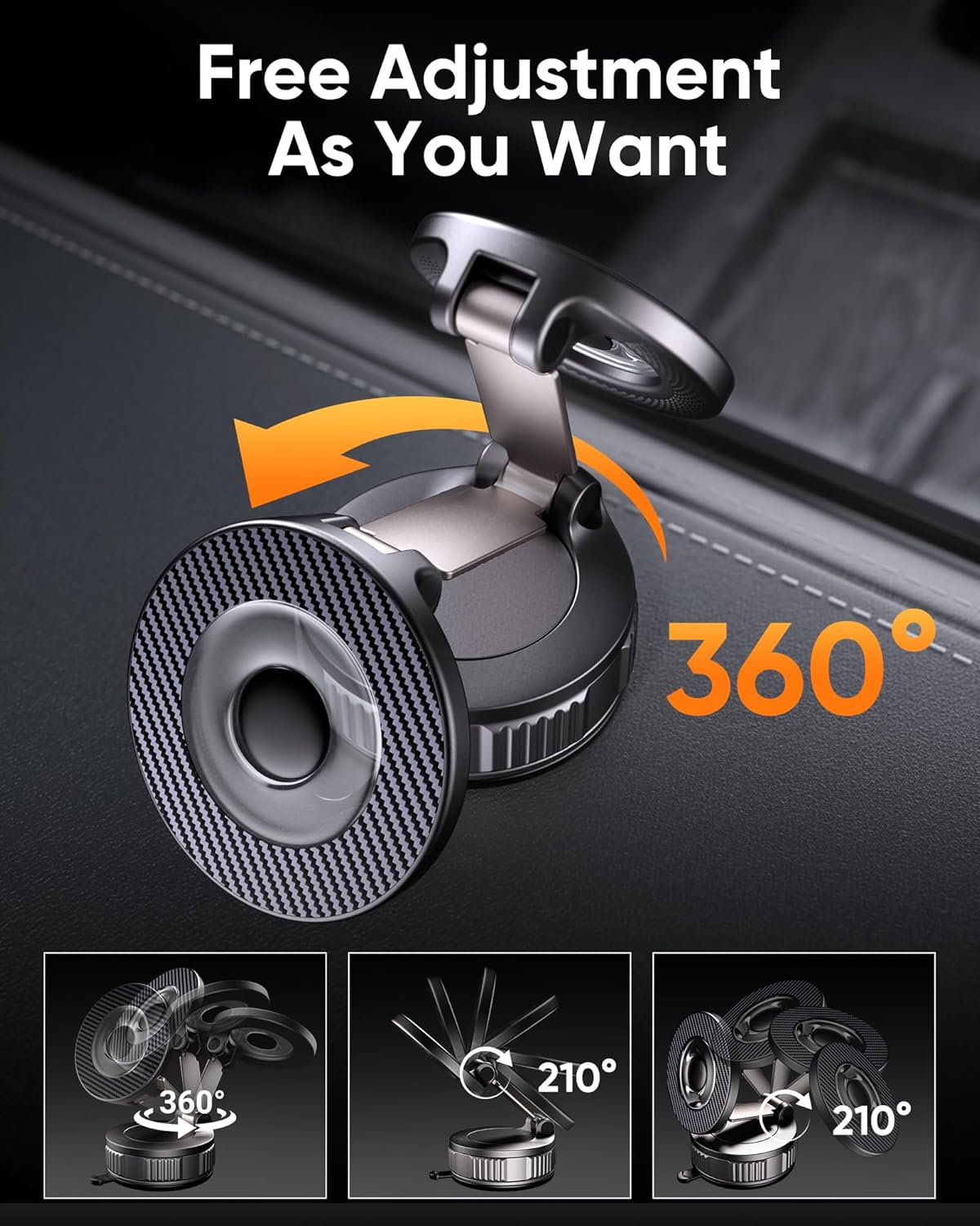 360° Rotation & Dual-Axis Adjustment: This car phone holder features a 360° rotating base and 210° dual-axis folding metal arms. allowing for effortless angle adjustments to achieve the perfect viewing position. Easily switch between portrait and landscape modes whether navigating in the car or on a video call. Its compact foldable design reduces size by 50% for neat storage. Rigorously tested over 6000 times for folding and swiveling. it guarantees long-term durability and stable performance